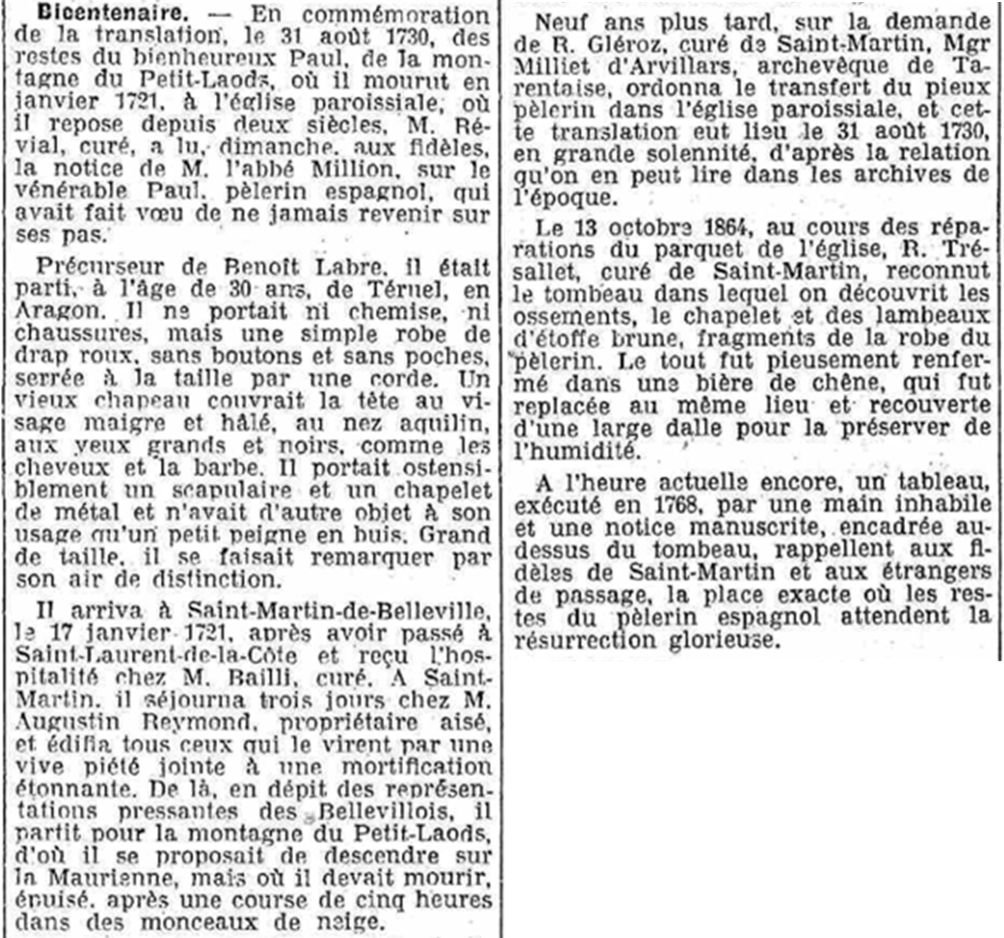 Article sur le bicentenaire de la translation des reliques de Paul le pèlerin – Le Petit Dauphinois (1930)