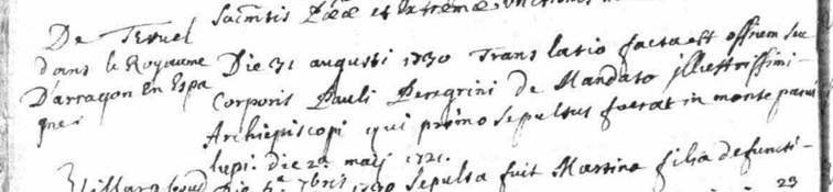 “Die 31 augusti 1730 translatio facta est ossium seu corporis Pauli peregrini de mandato Illustrissimi Archiepiscopi, qui primo sepultus fuerat in monte parvi lupi, die 2a Maii 1721.”